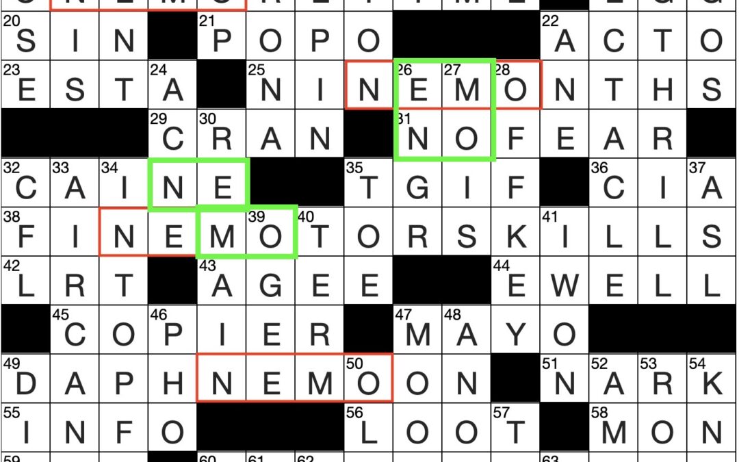 Filled in crossword grid for ClassiCanadian Crosswords 03 September 2025. Hidden "NEMOs' are highlighted in red outline, with additional ones highlighted in green outline