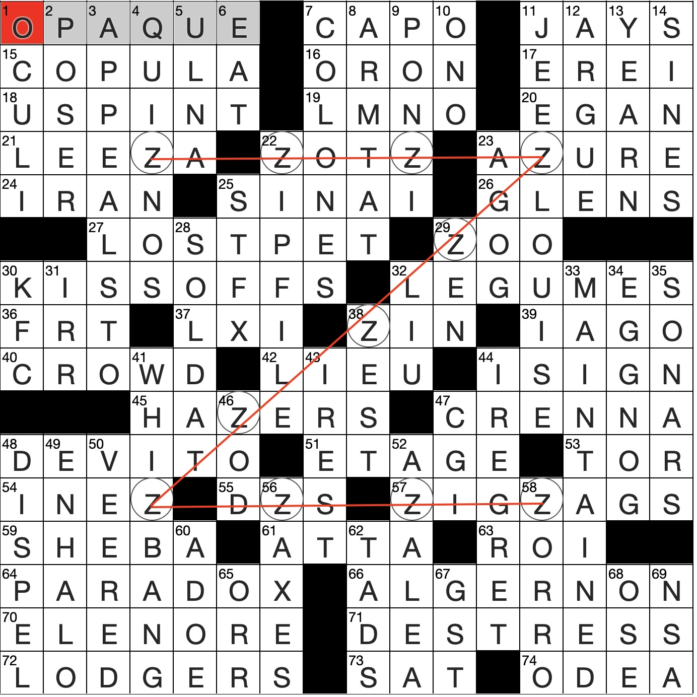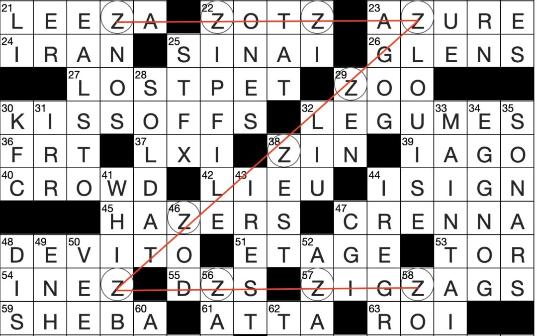 Filled in crossword grid for ClassiCanadian Crosswords 26 November 2025. Al the squares with the letter Z are circled and connected by a red line, showing the shape of a large letter Z