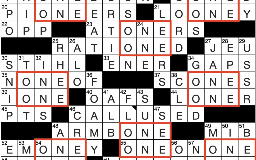 Filled in crossword grid for ClassiCanadian Crosswords 27 December 2023 with entries highlighted that have ONE over ONE in the grid